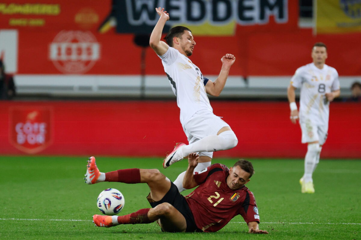10.10.2025, Belgien, Gent: Belgiens Jeremy Doku (M) kämpft mit Nordmazedoniens Darko Churlino (r) um den Ball. Foto: Geert Vanden Wijngaert/AP/dpa