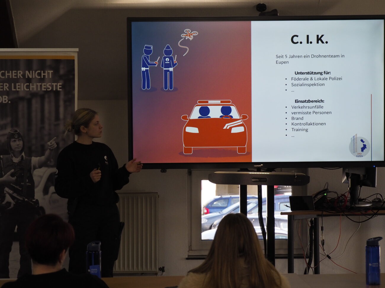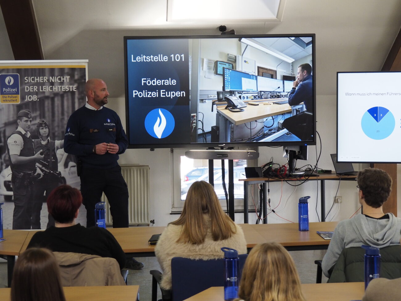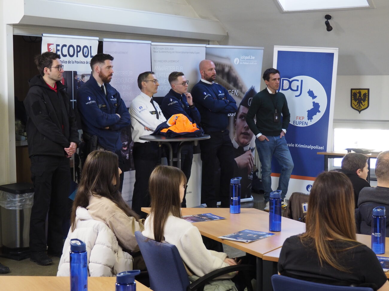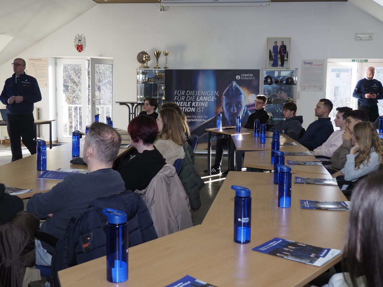 Auch Themen wie Arbeitszeiten, Spezialisierungsmöglichkeiten, Karrierewege innerhalb der föderalen oder lokalen Polizei sowie die Besonderheiten des Polizeidienstes in Ostbelgien wurden angesprochen.