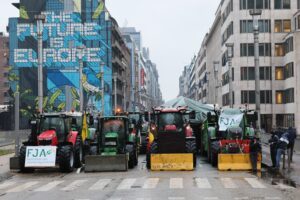 26.02.2024, Belgien, Brüssel: Traktoren stehen am frühen Morgen in der Wetstraat/Rue de la Loi während einer Protestaktion der Bauernverbände vor einem Treffen der EU-Agrarminister in Brüssel . Foto: Benoit Doppagne/Belga/dpa