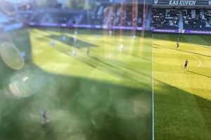 Auf DAZN war das Spiel der AS Eupen gegen den FC Lüttich, obwohl ein Derby, eine der vier Begegnungen, in denen sich die Fernsehzuschauer nur mit der Totalen begnügen mussten, weil nur automatisierte Kameras eingesetzt wurden. In der Anfangsviertelstunde war indes nur eine Hälfte mit der nötigen Bildschärfe zu sehen, während die andere Hälfte verschwommen blieb (siehe Bild oben). Obendrein gab es nur die Totale, also weder Nahaufnahmen noch Wiederholung und Zeitlupe.