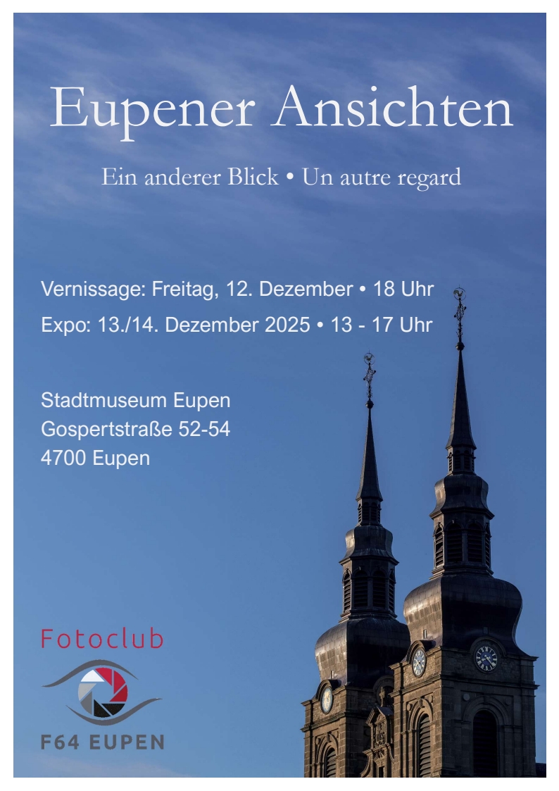 „Eupener Ansichten – Ein anderer Blick“: Mit diesem Motto präsentiert der Kgl. Fotoclub F64 Eupen am Samstag, 13. Dezember, und Sonntag, 14. Dezember, jeweils von 13 bis 17 Uhr – seine diesjährige Winterausstellung im Stadtmuseum Eupen.