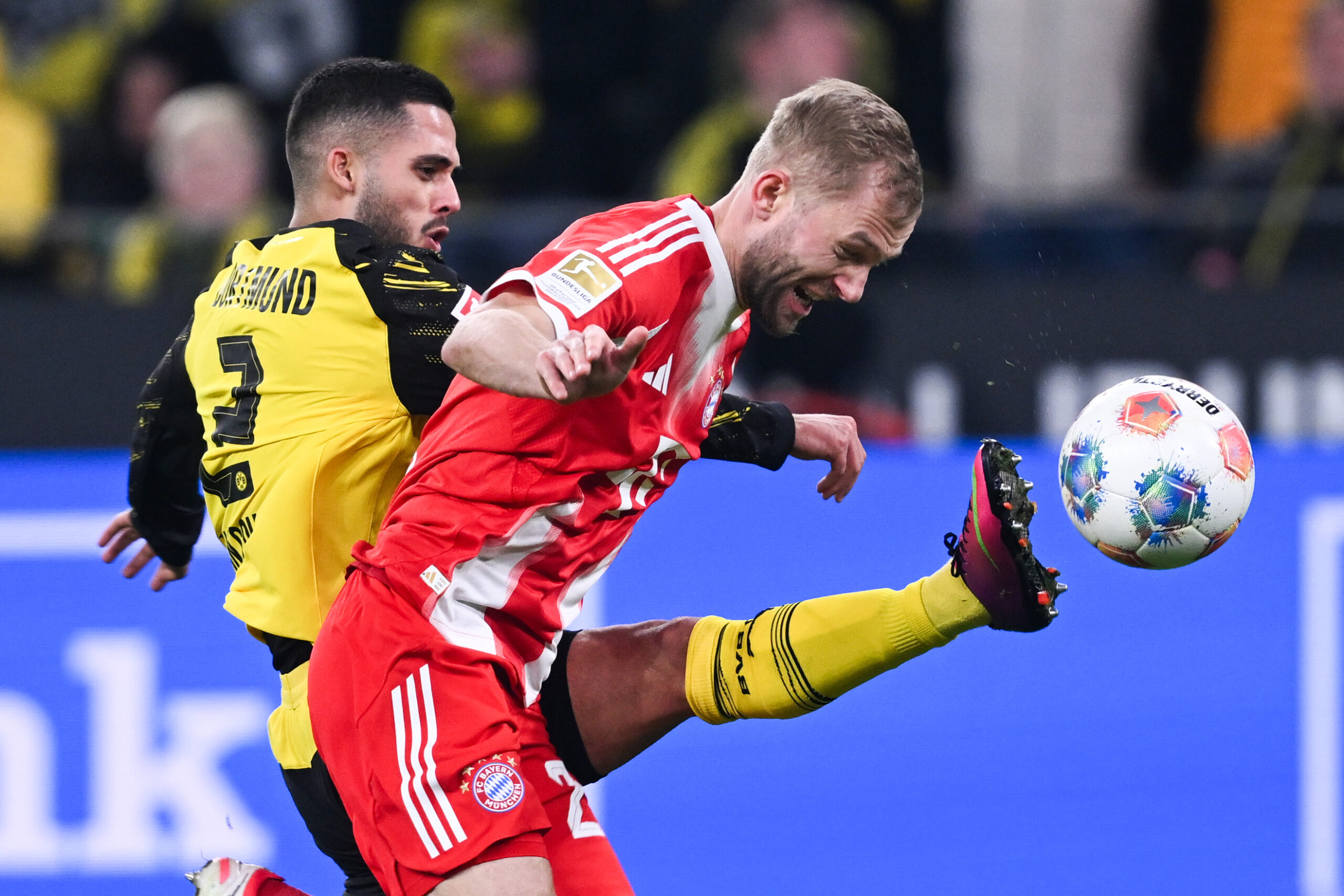 28.02.2026, Nordrhein-Westfalen, Dortmund: Yan Couto (Borussia Dortmund) (l) und Konrad Laimer (Bayern München) kämpfen um den Ball. Foto: David Inderlied/dpa