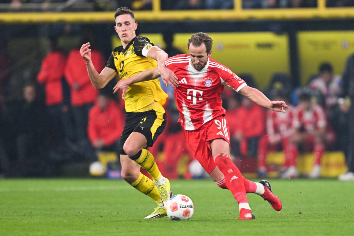 28.02.2026, Nordrhein-Westfalen, Dortmund: Nico Schlotterbeck (Borussia Dortmund) (l) und Harry Kane (Bayern München) kämpfen um den Ball. Foto: David Inderlied/dpa
