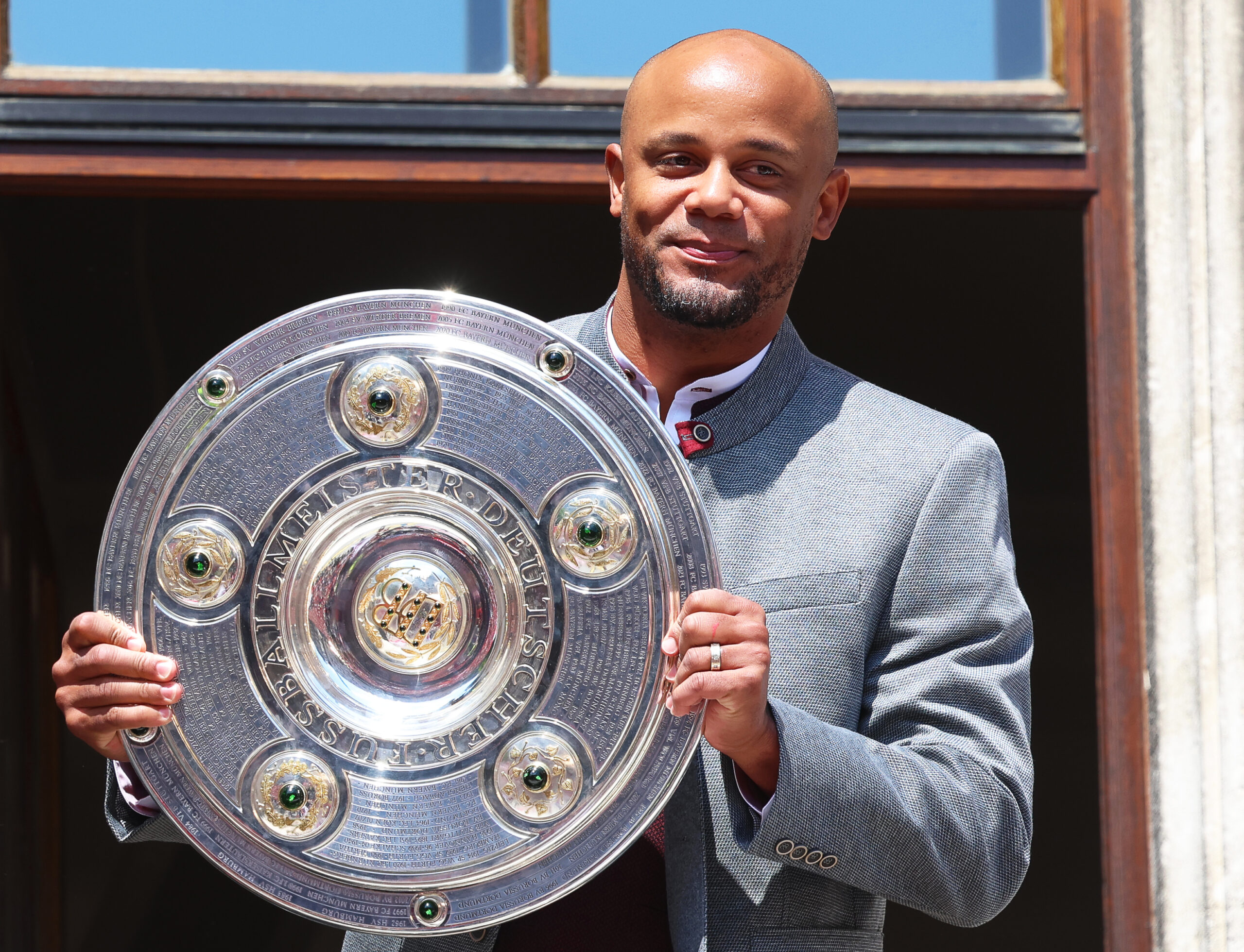 18.05.2025, Bayern, München: Trainer Vincent Kompany steht am 18. Mai 2025 mit der Meisterschale auf dem Rathaus-Balkon. Foto: Karl-Josef Hildenbrand/dpa