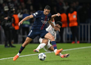 04.11.2025, Frankreich, Paris: Achraf Hakimi (l, Paris Saint-Germain) gegen Luis Díaz (Bayern München). Der Bayern-Spieler sah deswegen Rot. Foto: Federico Gambarini/dpa