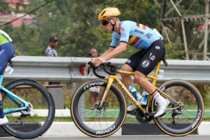 28.09.2025, Ruanda, Kigali: Der Belgier Remco Evenepoel in Aktion. Bei Doppel-Olympiasieger Evenepoel wurde wieder einmal deutlich, dass er zwar über einen großen Motor verfügt, an den langen Anstiegen aber gegen Pogacar hoffnungslos unterlegen ist.Foto: Jerome Delay/AP/dpa