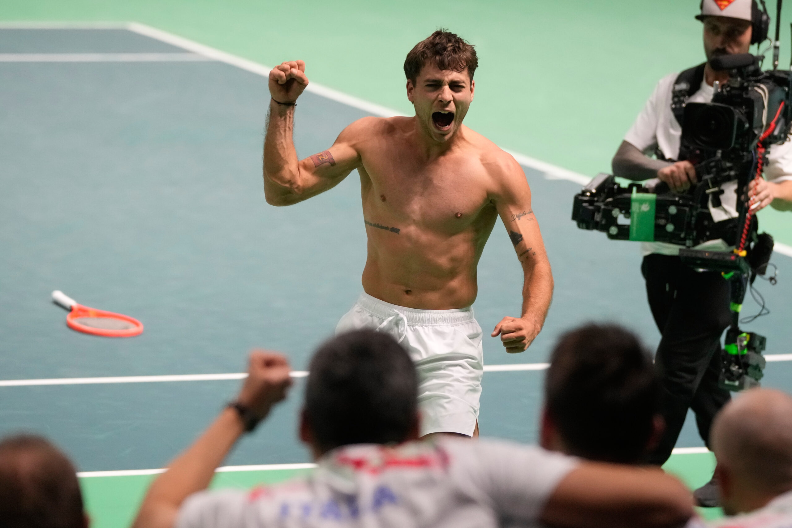 21.11.2025, Italien, Bologna: Italiens Flavio Cobolli jubelt nach seinem Sieg. Foto: Luca Bruno/AP/dpa