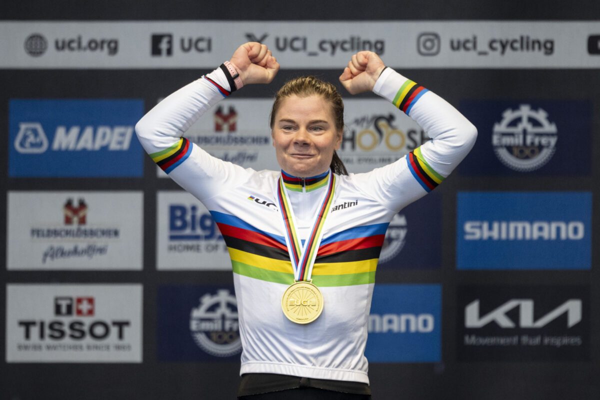 28.09.2024, Schweiz, Zürich: Die Belgierin Lotte Kopecky feiert ihre Goldmedaille im Straßenrennen der Frauen. Foto: Ennio Leanza/KEYSTONE/dpa