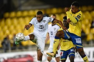 Eine Szene aus dem Spiel vom 15. Oktober 2016 in Waasland-Beveren, das die AS mit 2:4 verlor: François Marquet (Mitte) erzielt das 1:0 für Waasland. Henry Onyekuru (links) und Siebe Blondelle (rechts) können den Treffer nicht verhindern. Foto: Belga