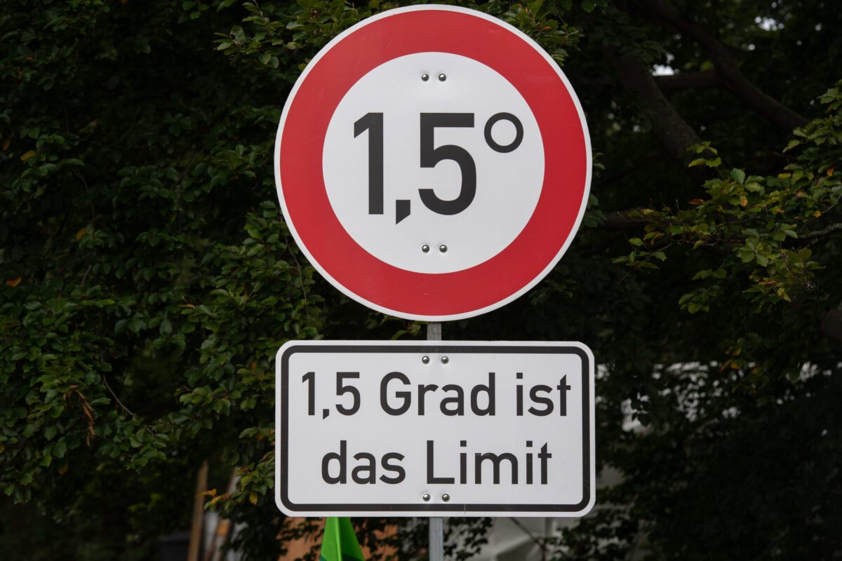 03.10.2021, Berlin: Mit diesen Schildern machen Klima-Aktivisten unweit des Hauses der Kulturen der Welt auf das Ziel des Pariser Klimaabkommens aufmerksam, den globalen Temperaturanstieg auf 1,5 Grad gegenüber der vorindustriellen Zeit zu begrenzen. Foto: Paul Zinken/dpa