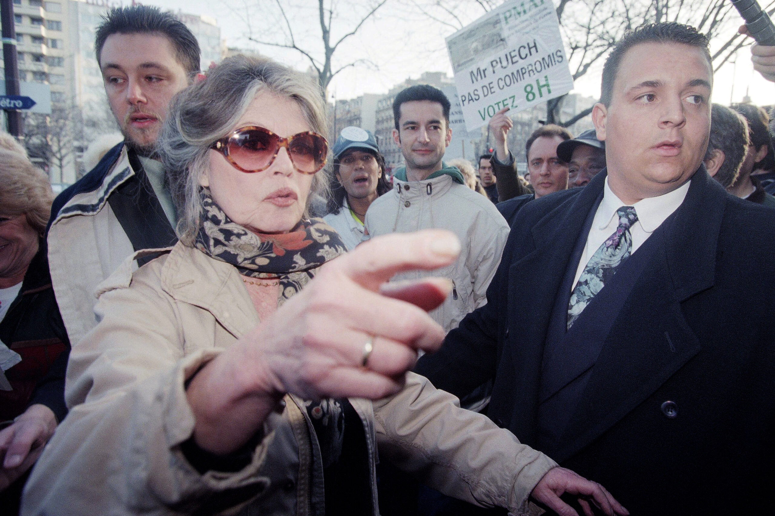 25.02.1995, Frankreich, Paris: Der ehemalige französische Filmstar und Tierschutzaktivist Brigitte Bardot gestikuliert während einer Demonstration gegen die Dauer von Tiertransporten zum Schlachten vor der 32. Landwirtschaftsmesse in Paris am 26. Februar 1995. Foto: Lionel Cironneau/AP/dpa