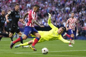 12.10.2022, Spanien, Madrid: Angel Correa (vorne) von Atlético Madrid erzielt ein Tor gegen den überragenden Simon Mignolet, das wegen Abseits nicht anerkannt wurde. Foto: Manu Fernandez/AP/dpa