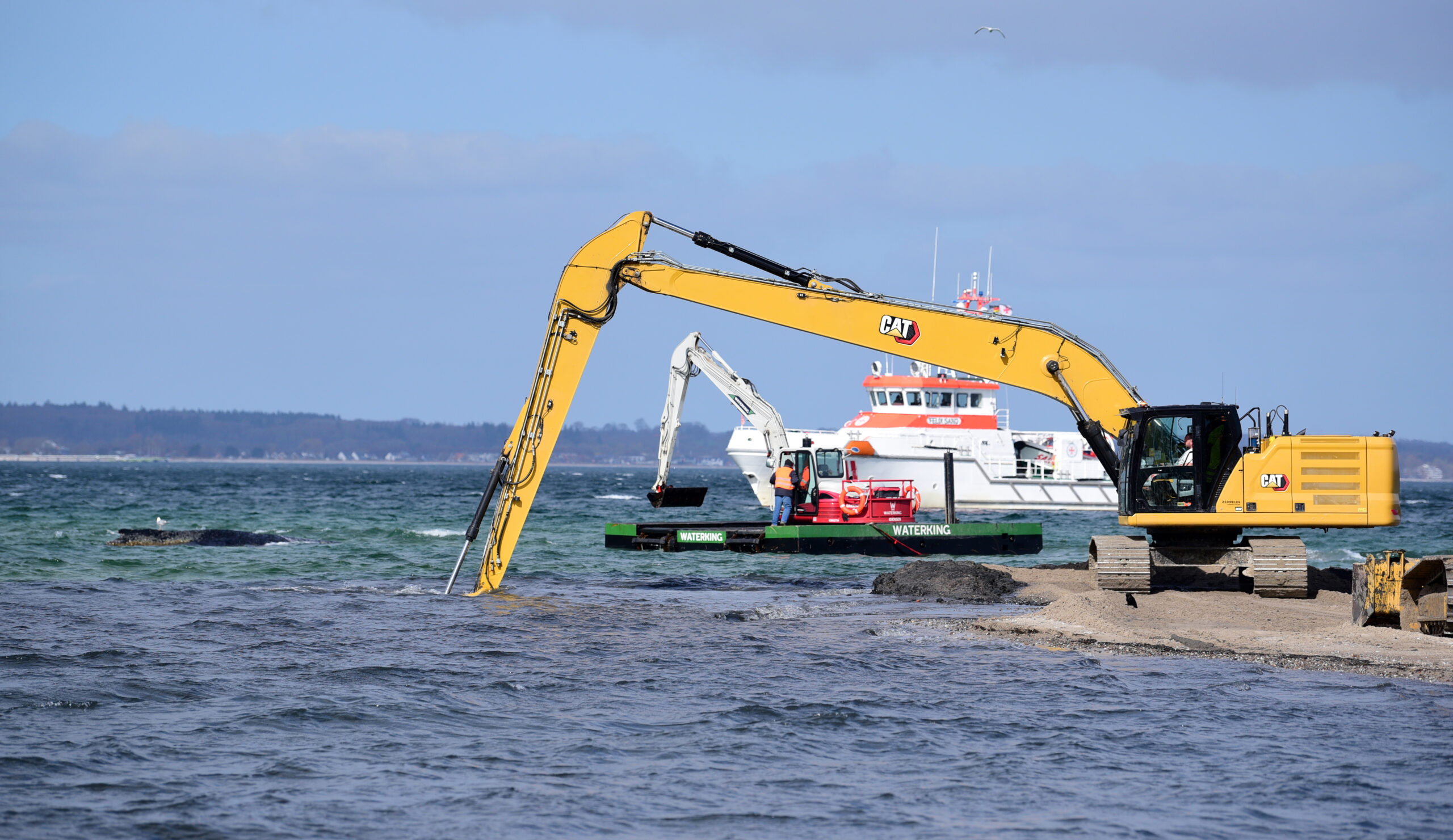 26.03.2026, Schleswig-Holstein, Timmendorfer Strand: Bagger arbeiten in der Nähe von einem gestrandeten Wal. Experten versuchen erneut, den vor Timmendorfer Strand festsitzenden Buckelwal freizubekommen. Dafür wird schweres Gerät eingesetzt. Foto: Daniel Bockwoldt/dpa