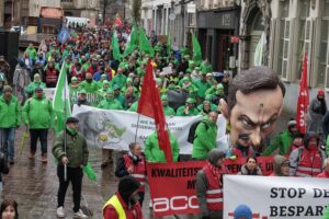 25.11.2025, Belgien, Gent: In Gent findet ein Marsch der Arbeitnehmer statt, zu dem die Gewerkschaften aufgerufen haben, um die Folgen der Maßnahmen der Föderalregierung anzuprangern. Die Aktion ist Teil eines dreitägigen Streiks. Foto: Nicolas Maeterlinck/Belga/dpa