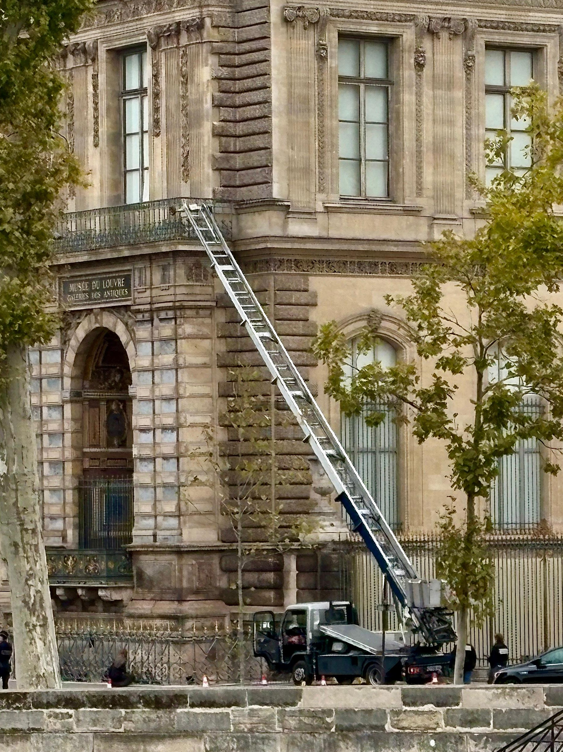 – Täter sollen Lastenaufzug an Baustelle genutzt haben: Die vollständig vermummten Täter waren über eine an der zur Seine gelegene Gebäudeseite, wo gerade Bauarbeiten stattfinden, in das Museum eingedrungen. Sie sollen einen Lastenaufzug benutzt haben, um direkt in den gewünschten Ausstellungsraum in der Galerie d’Apollon zu gelangen. Nachdem die Täter die Fenster wohl mit einem Trennschleifer oder kleinen Kettensägen zerstört hätten, seien zwei Männer ins Innere eingedrungen, während ein dritter draußen Wache gestanden hätte, berichteten Medien.