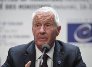 17.05.2019, Finnland, Helsinki: Der damalige Generalsekretär des Europarates, Thorbjörn Jagland, spricht während der Pressekonferenz der Außenminister des Europarates in Helsinki. In Norwegen wird gegen den früheren Ministerpräsidenten Jagland wegen Korruption ermittelt. Die Ermittlungen kamen durch die Veröffentlichung der Epstein-Akten ins Rollen. Foto: Martti Kainulainen/Lehtikuva/dpa