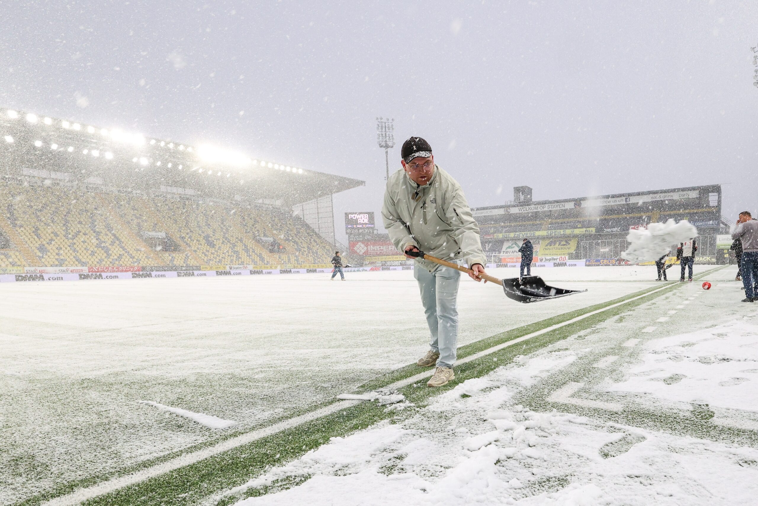 15.02.2026, Belgien, Sint-Truiden: Der Kunstrasen des Stadions Stayen wird vor dem Fußballspiel zwischen Sint-Truiden VV und Zulte Waregem der Jupiler Pro League vom Schnee befreit, damit die Begegnung überhaupt stattfinden konnte. Foto: Bruno Fahy/Belga/dpa
