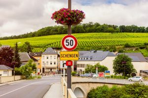 Luxemburg, Schengen: Blick auf den Ortseingang von Schengen in Luxemburg am 22. März 1995. Der kleine Ort wurde durch das nach ihm benannte Abkommen ein Begriff. Foto: Shutterstock