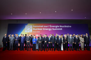 10.03.2026, Frankreich, Paris: Der französische Präsident Emmanuel Macron, vordere Reihe Mitte, flankiert von Rafael Grossi, Generaldirektor der Internationalen Atomenergie-Organisation (IAEO), siebter von links, und der Präsidentin der Europäischen Kommission Ursula von der Leyen, sechste von links, posieren mit Staats- und Regierungschefs für ein Familienfoto. Foto: Abdul Saboor/Pool Reuters via AP/dpa