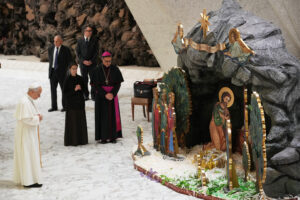 15.12.2025, Vatikan, Vatikanstadt: Papst Leo XIV. (l) betet neben Schwester Raffaella Petrini (2.v.l), Präsidentin des Governatorats und damit Verwaltungschefin des Kirchenstaats, vor einer Krippe in der Halle Paul VI. während einer Audienz mit Spendern des Weihnachtsbaums und der Krippen im Vatikan. Foto: Alessandra Tarantino/AP/dpa