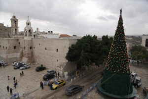 25.11.2025, Palästinensische Gebiete, Bethlehem: Palästinensische Arbeiter bereiten einen Weihnachtsbaum auf dem Bethlehemkirchplatz neben der Geburtskirche in der Stadt Bethlehem im Westjordanland vor. Foto: Mahmoud Illean/AP/dpa