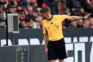 14.03.2026, Nordrhein-Westfalen, Leverkusen: Schiedsrichter Christian Dingert schaut sich das Bayern-Tor zum 1:1 durch J. Tah an, das anschließend nicht anerkannt, sondern annulliert wird. Foto: Federico Gambarini/dpa