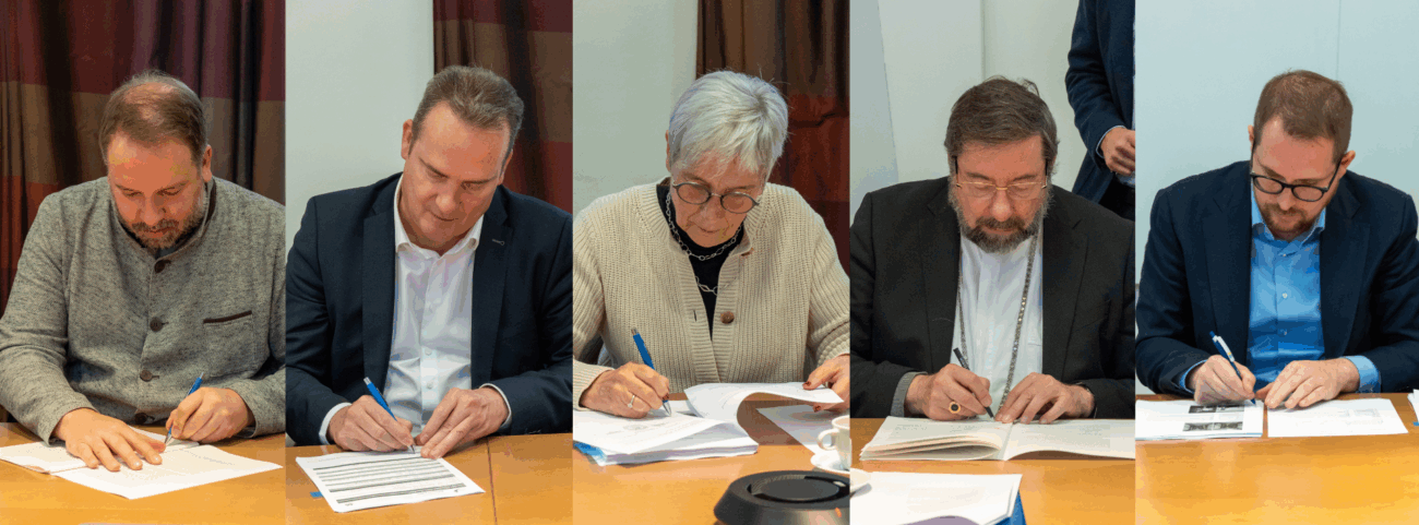 Unterzeichnet haben die Deutschsprachige Gemeinschaft (Ministerpräsident Oliver Paasch und Minister Jérôme Franssen), die VoG Evêché de Liège (Mgr. Jean-Pierre Delville), die VoG Bischöfliche Schulen in der Deutschsprachigen Gemeinschaft (BSDG) (Brigitte Piel) sowie die Stadt Eupen (Thomas Lennertz).