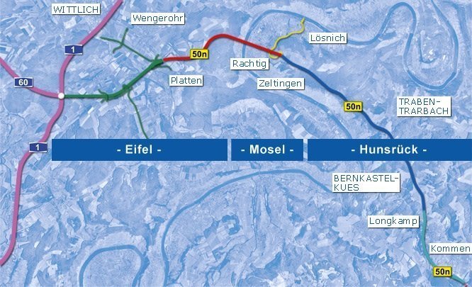 Die Hochmoselbrücke schafft mit dem Neu- und Ausbau der B50 eine direkte Straßenverbindung zwischen den Benelux-Staaten und dem Rhein-Main-Gebiet.