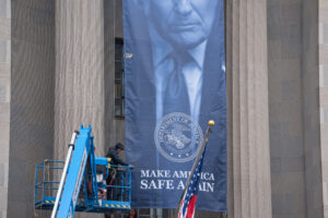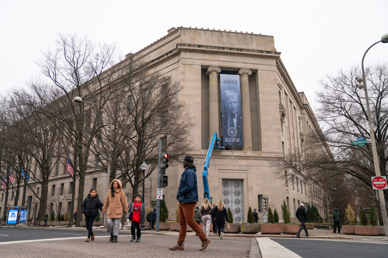 In Washington wurde am Hauptgebäude des US-Justizministeriums (Department of Justice, DOJ) ein sehr großes Banner mit dem Porträt von US-Präsident Donald Trump und dem Schriftzug „Make America Safe Again“ angebracht, einem Slogan, den seine Regierung für ihre Politik zur Bekämpfung von illegaler Einwanderung und Gewaltverbrechen nutzt.