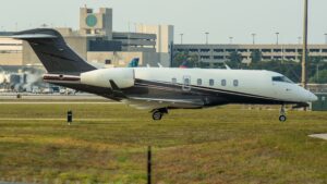 03.03.2023, USA, West Palm Beach: Ein Privatflugzeug im Taxi für spätere Abfahrt vom Flughafen Palm Beach International, einem Bombardier Challenger 300. Der Flughafen soll nach Donald Trump benannt werden. Foto: Shutterstock