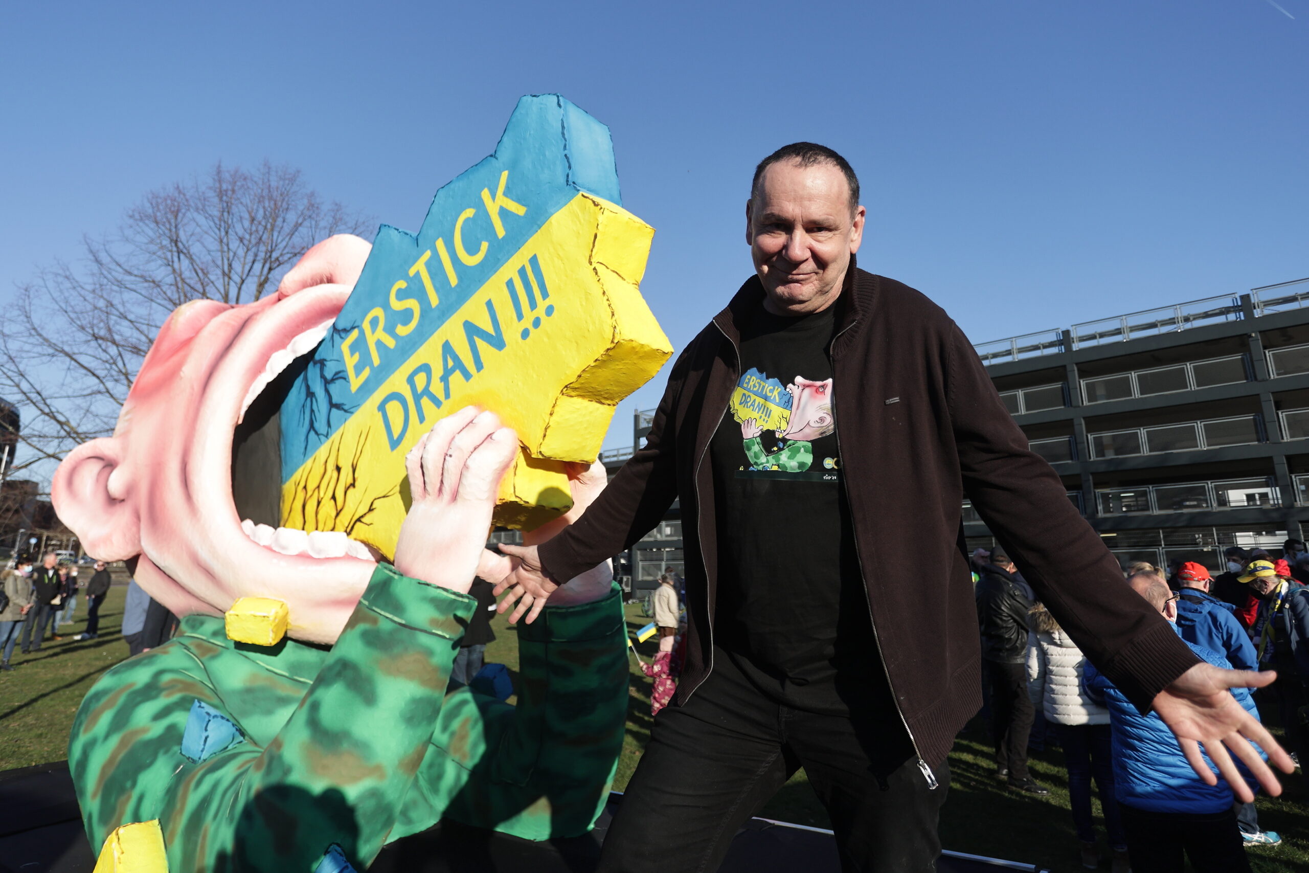 03.03.2022, Nordrhein-Westfalen, Düsseldorf: Jacques Tilly, Karneval Wagenbauer, steht neben seiner kreierten Figur, die Putin zeigt, wie er an der Ukraine erstickt. Foto: David Young/dpa
