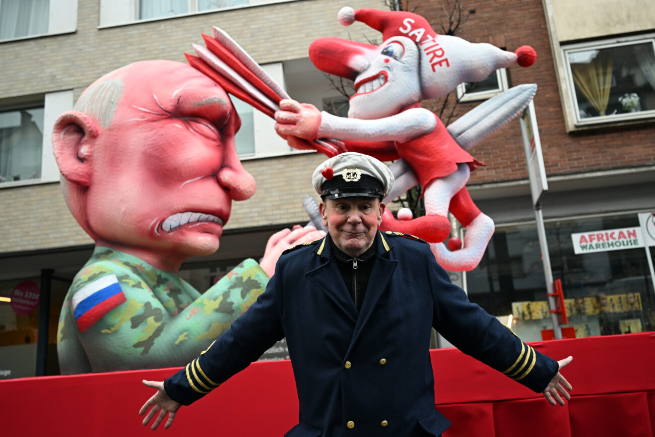 In diesem Jahr gab es einen Wagen mit Blick auf den Prozess in Moskau – eine Skulptur von Putin in Uniform spießt da die Düsseldorfer Karnevalsfigur Hoppeditz mit einem Schwert auf.
