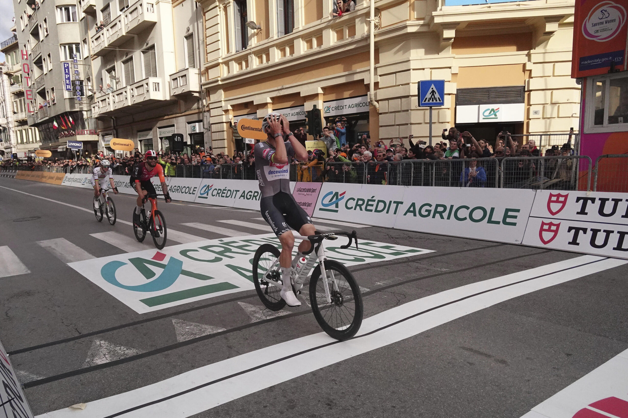 22.03.2025, Italien, Sanremo: Mathieu van der Poel (r-l) überquert vor Filippo Ganna und Tadej Pogacar die Ziellinie und gewinnt. Foto: Massimo Paolone/LaPresse/dpa