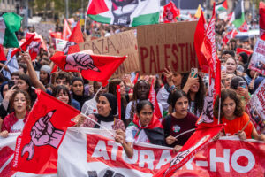 02.10.2025, Spanien, Barcelona: Tausende von Studenten rufen zum Streik auf und gehen auf die Straße, um gegen Israel und in Solidarität mit Palästina zu protestieren, einen Tag nachdem das israelische Militär die Schiffe der Global Summud Flotilla abgefangen hat. Foto: Marc Asensio Clupes/ZUMA Press Wire/dpa