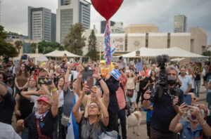 09.10.2025, Israel, Tel Aviv: Menschen versammeln sich auf dem Geiselplatz in Tel Aviv, um das Waffenstillstandsabkommen zu feiern. Foto: Ilia Yefimovich/dpa