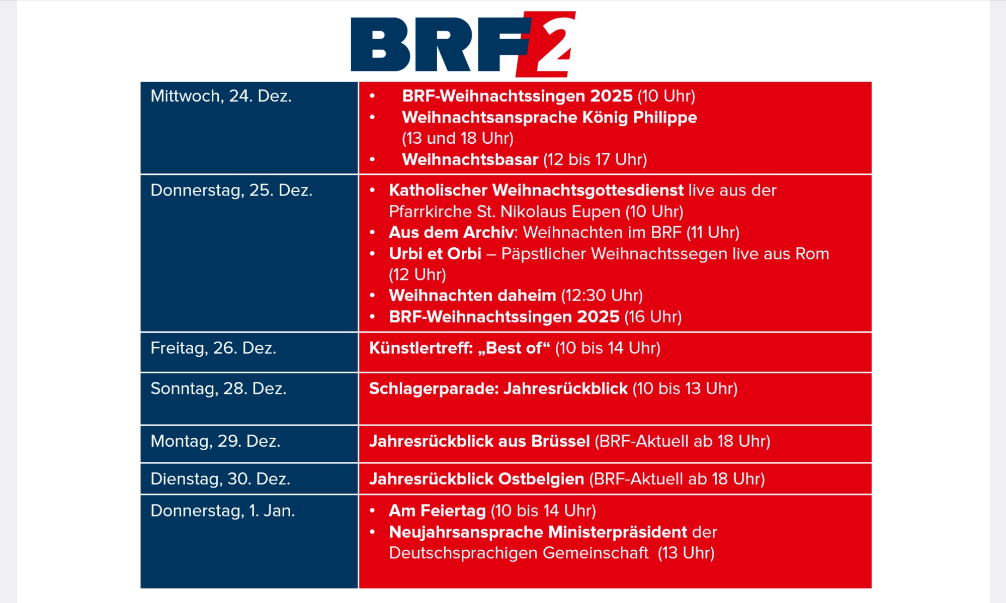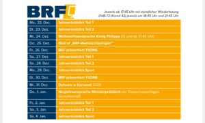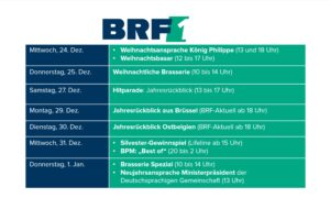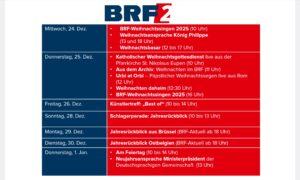 – Am 29. Dezember wird in „BRF Aktuell“ (BRF1 und BRF2) auf das auslaufende Jahr aus Brüsseler Sicht zurückgeblickt, der regionale Radio-Rückblick auf das Jahr 2025 folgt am 30. Dezember – jeweils ab 18 Uhr.