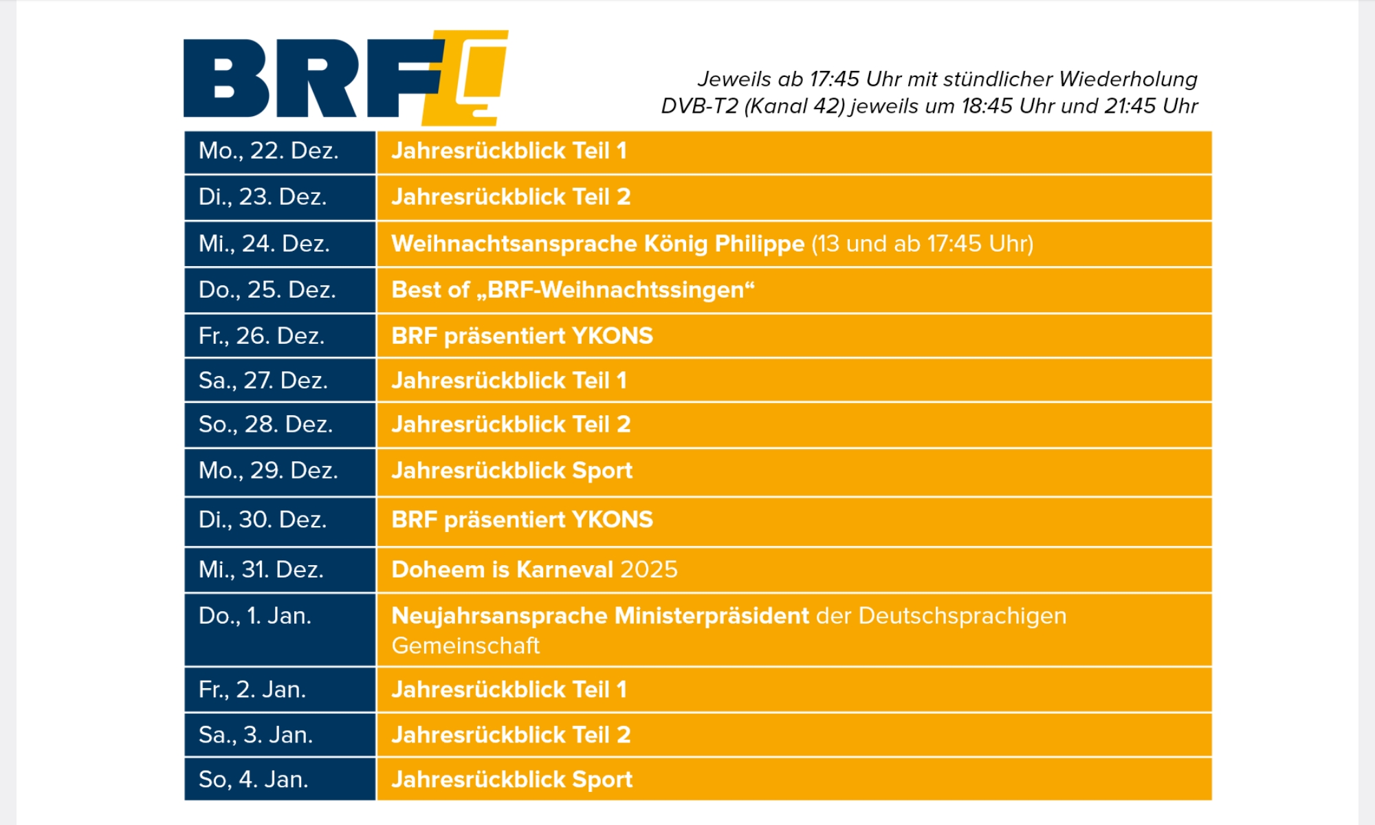 Ein Highlight im BRF-Fernsehen sowie in der BRF-Mediathek sind die Rückblicke auf das Jahr 2025. Teil eins läuft am 22. und 27. Dezember sowie am 2. Januar; Teil zwei am 23. und 28. Dezember und am 3. Januar und auf das Sportjahr in Ostbelgien wird am 29. Dezember und am 4. Januar zurückgeblickt – jeweils stündlich ab 17.45 Uhr.