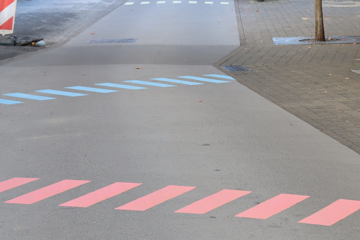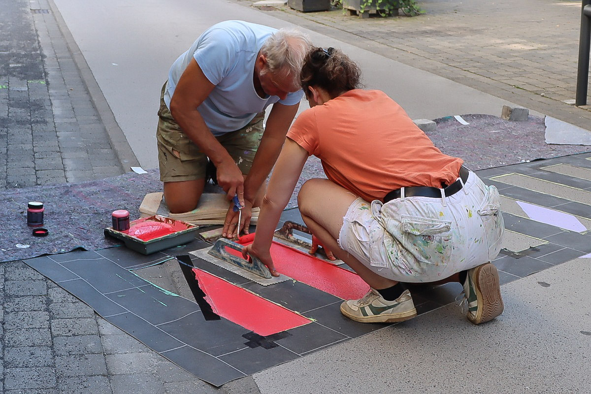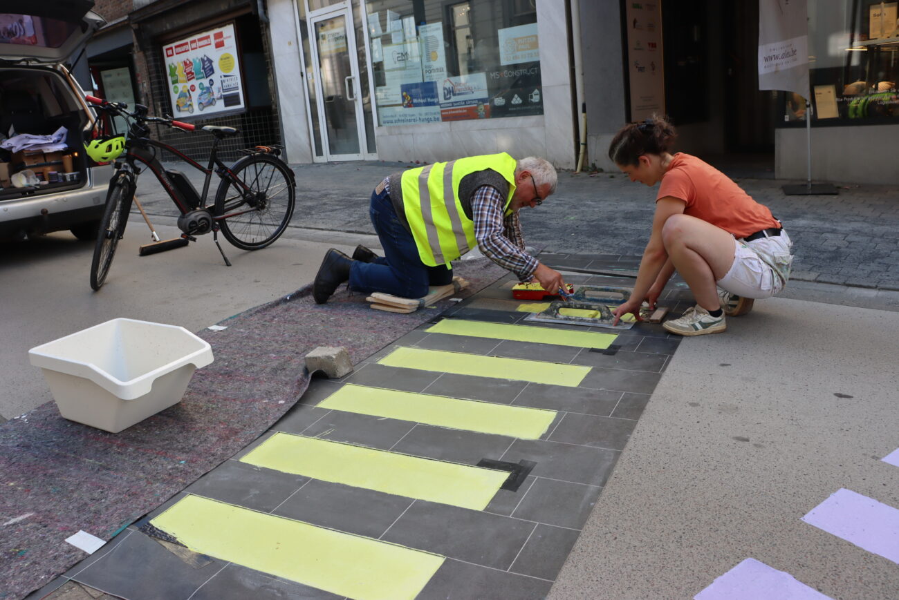 Die Fahrbahn wurde durch den regionalen Künstler Sebastian Schmidt gestaltet, der bereits ein ähnliches Projekt in der Mefferdatisstraße in Aachen umgesetzt hat. „Es geht bei den bunten Markierungen darum, auf die Begegnungszone hinzuweisen, in der das Tempolimit von 20 km/h gilt. Autofahrer sollen dazu bewegt werden, langsamer zu fahren“, so die Stadt Eupen.