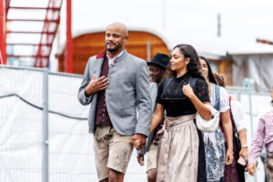05.10.2025, Bayern, München: Bayern-Trainer Vincent Kompany und seine Frau Carla Higgs mit Sohn Caleb (l) und Sohn Kai (r) auf dem Oktoberfest. Foto: Matthias Balk/dpa
