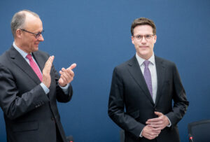 Die deutlichen Zugewinne der CDU und die Gleichzahl der Mandate müssten „in der Regierungspolitik und vorher in einem möglichen Koalitionsvertrag sich in einer Balance abbilden“, sagte Kanzler und CDU-Bundeschef Merz mit Blick auf ein mögliches Bündnis aus Grünen und Union.