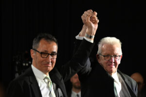 08.03.2026, Baden-Württemberg, Stuttgart: Cem Özdemir (Bündnis 90/Die Grünen), Spitzenkandidat Landtagswahl Baden-Württemberg, und Winfried Kretschmann (Bündnis 90/Die Grünen), Ministerpräsident Baden-Württemberg, stehen bei der Wahlparty ihrer Partei nebeneinander und recken gemeinsam die Arme hoch. Foto: Bernd Weißbrod/dpa