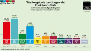 – Historisches Tief für SPD: Die CDU steigerte ihren Stimmenanteil im Vergleich zur letzten Wahl auf 31,0 Prozent (27,7 Prozent). Die SPD stürzte auf 25,9 Prozent (2021: 35,7) – ein historisches Tief für die Traditionspartei bei Landtagswahlen in Rheinland-Pfalz. Die AfD sprang auf 19,5 Prozent (8,3) – ihr Rekordwert bei Landtagswahlen an Rhein und Mosel.