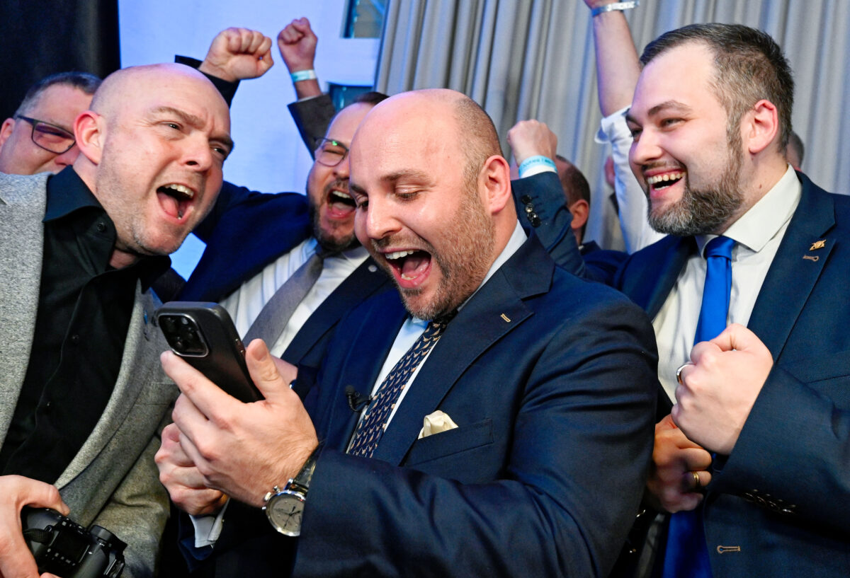 08.03.2026, Baden-Württemberg, Stuttgart: AfD-Spitzenkandidat Markus Frohnmaier (M) und Anhänger reagieren in der Landesgeschäftsstelle der AfD bei Bekanntgabe der ersten offiziellen Hochrechnung um 18 Uhr. Foto: Uwe Anspach/dpa