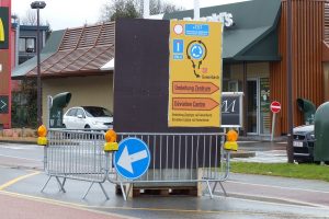 Wer also die erste Umleitung auf Höhe des Geschäfts Lederland verpasst hat und, anstatt rechts die Industriestraße zu nehmen, weiter geradeaus auf der Herbesthaler Straße gefahren ist, wird am McDonald’s gebeten, die Umleitung über die Gewerbestraße zu nehmen, um dann via Kongogasse, Garnstock und Vervierser Straße ins Eupener Stadtzentrum zu gelangen (anstatt über Hochstraße, Nörether Straße oder Simarstraße).