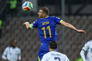 31.03.2026, Bosnien-Herzegowina, Zenica: Edin Dzeko (Bosnien-Herzegowina) köpft den Ball. Der Stürmer von Schalke 04 verletzte sich am Ende der Verlängerung. Foto: Armin Durgut/AP/dpa