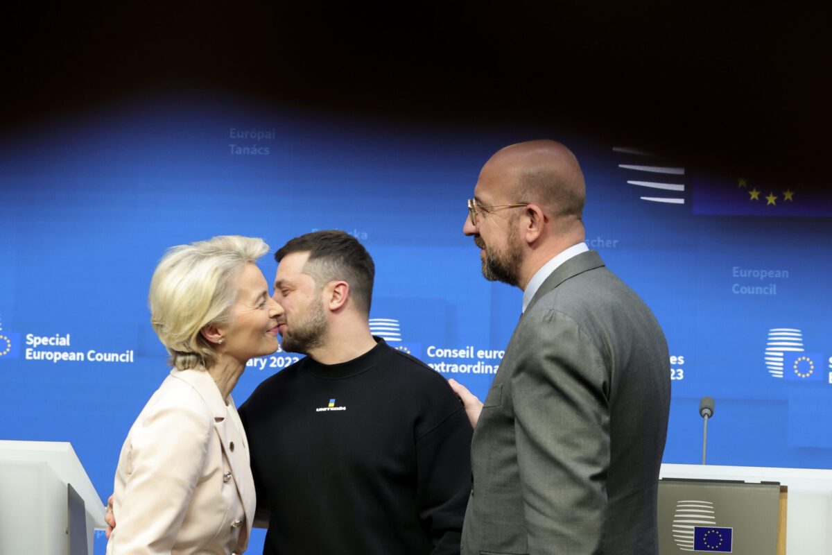 09.02.2023, Belgien, Brüssel: Ursula von der Leyen (l-r), Präsidentin der Europäischen Kommission, Wolodymyr Selenskyj, Präsident der Ukraine, und Charles Michel, Präsident des Europäischen Rates. Foto: Olivier Matthys/AP/dpa