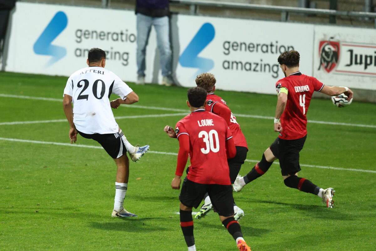 04.10.2025, Belgien, Eupen: Zakaria Atteri (20) von der AS Eupen erzielt das Tor zum 2:0. Die Partie endete 2:2. Foto: Belga
