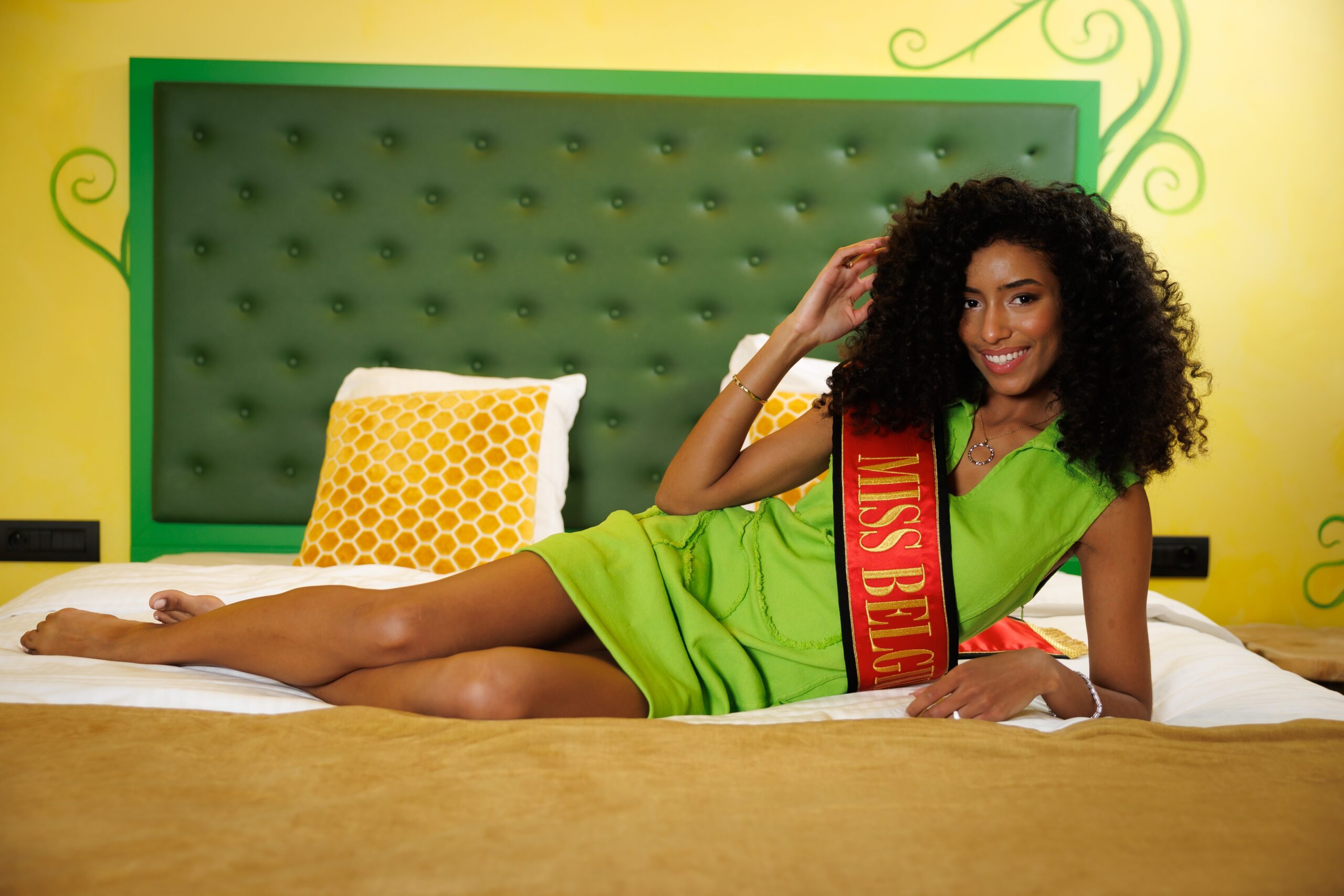 Die neu gewählte Miss Belgien 2026, Olga Lombardo, posiert für den Fotografen während des traditionellen ersten Fotoshootings der neuen Miss im Plopsa Hotel im Plopsaland in De Panne, am Sonntag, dem 22. Februar 2026. Foto: Belga