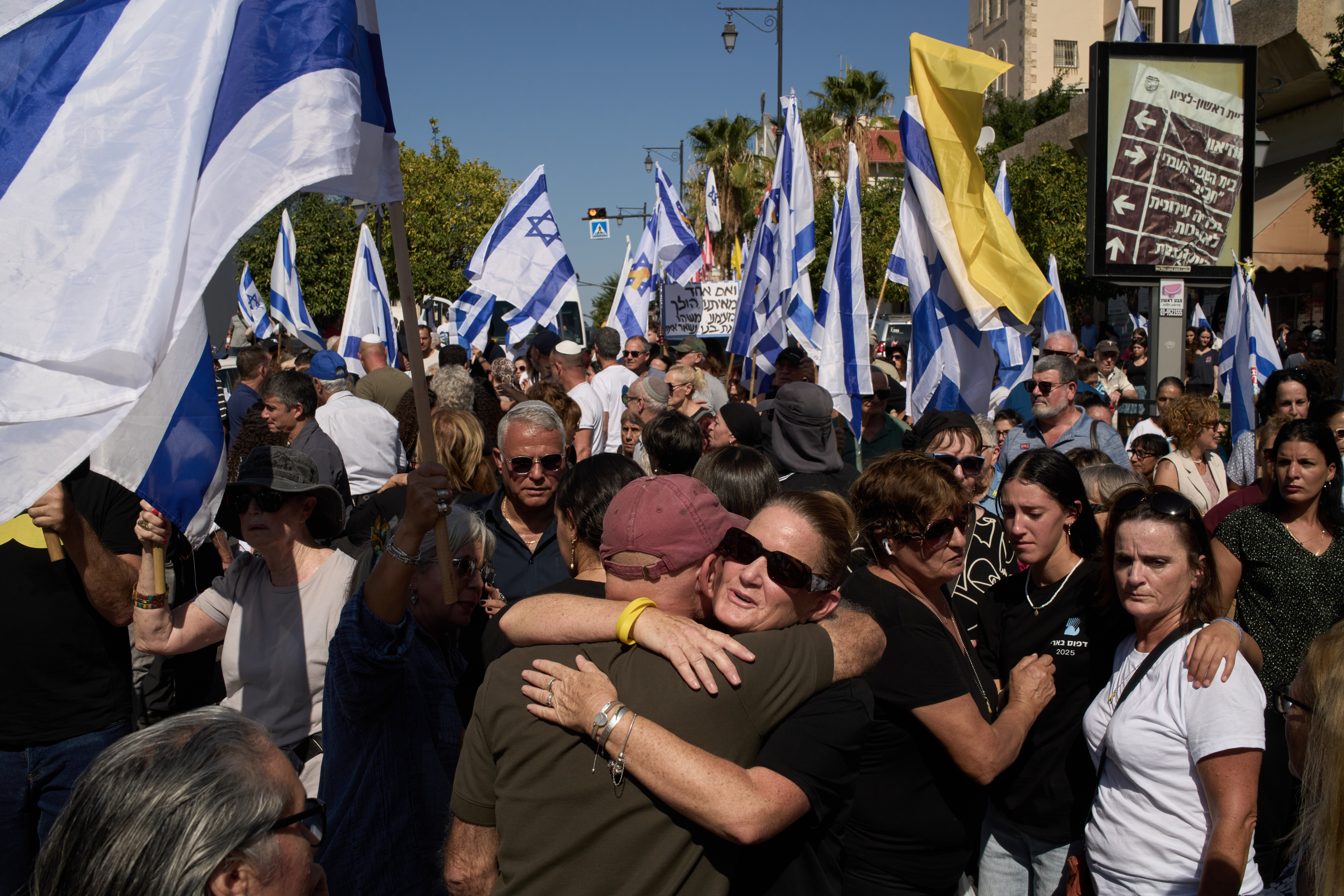 27.10.2025, Israel, Rischon LeZion: Angehörige und Freunde trauern in der Nähe des Wagens, in dem der Sarg der getöteten Geisel Yossi Sharabi transportiert wird, während eines Trauerzuges. Foto: Leo Correa/AP/dpa