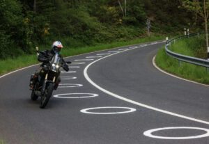 Das Verkehrsministerium begleitet den Versuch. Die rundlichen Markierungen sollen bewirken, dass Motorradfahrer die Kurve nicht schneiden.